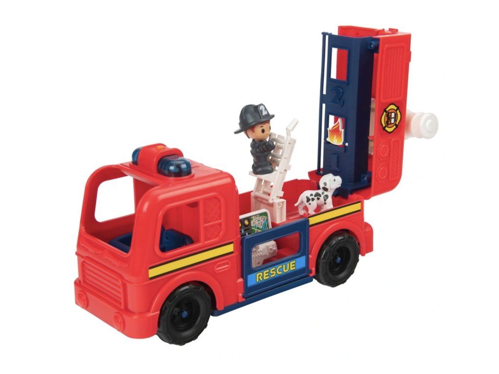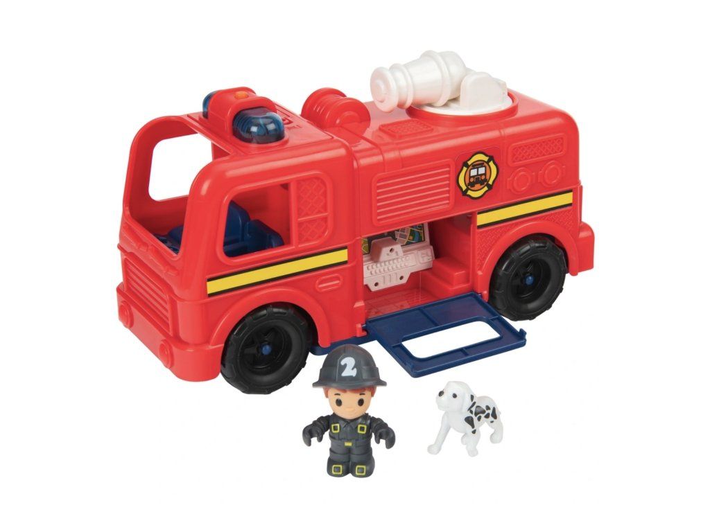 Hasič a jeho věrný pes se mohou svézt ve volně se pohybujícím hasičském voze, který má kabinu řidiče a interiér. Součástí je výsuvný žebřík pro záchranné mise a navigační obrazovka, která vám pomůže bezpečně navést vozidlo k cíli. Otevřete střechu a prohlédněte si celý interiér! Stiskněte tlačítko pro aktivaci sirén a představte si, že hasíte požáry pohyblivým hasičským dělem.