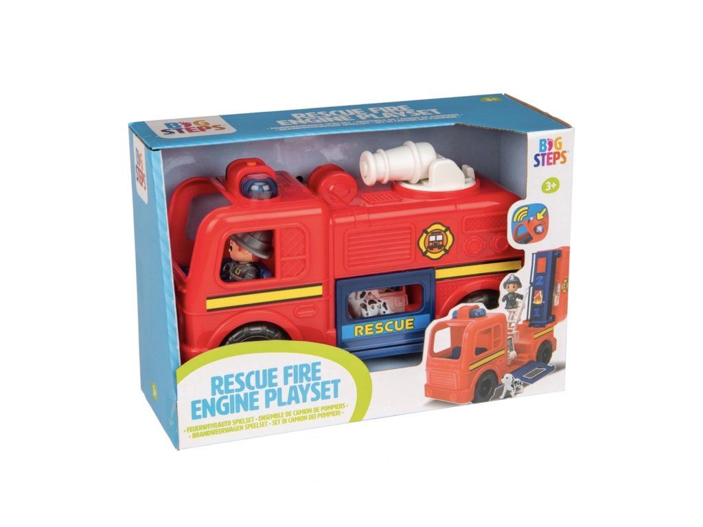 S hasičským vozem Big Steps jste vždy připraveni zachránit situaci! Tato sada hasičského vozu plná funkcí obsahuje světelné a zvukové efekty, polohovatelnou figurku hasiče a užitečného hasičského psa pro hasičská a záchranářská dobrodružství.