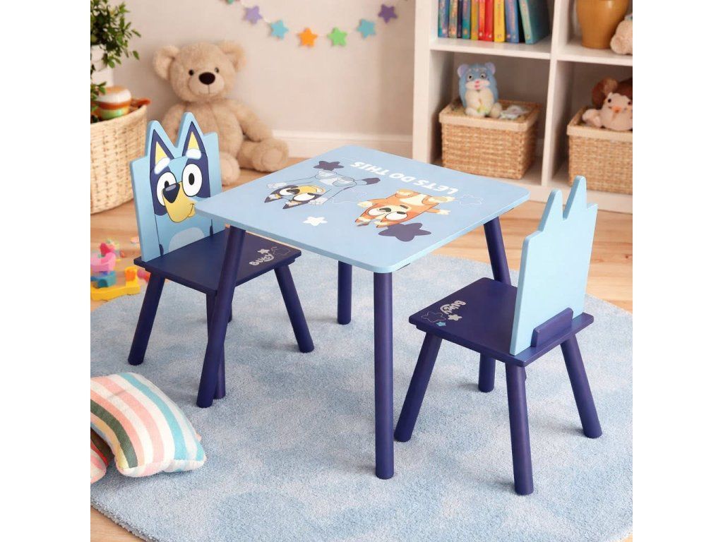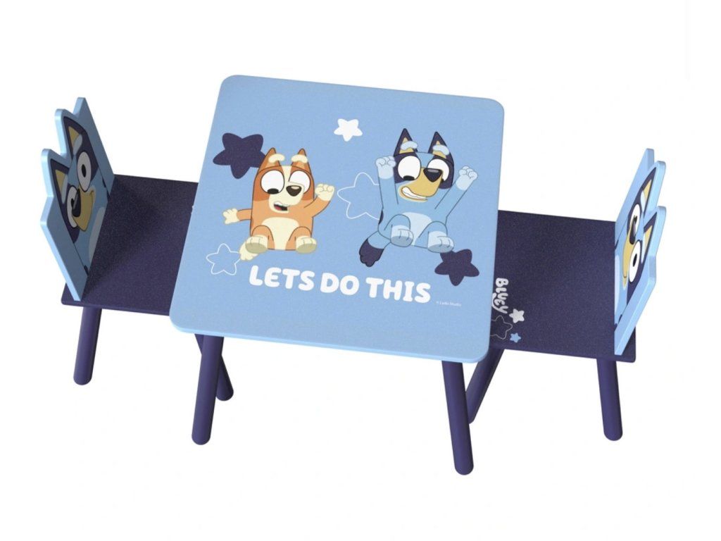 Na desce této roztomilé modré sady stolu a židlí je napsáno „Pojďme do toho!“. Toto poselství dokonale vystihuje ducha série Bluey, která oslavuje kouzlo volné hry a dětské kreativity. Je také ideální pro společné kreslení, tvoření a další aktivity, pro které se dětský stůl dokonale hodí. Obě židle mají opěradla s portrétem hrdinky seriálu, feny Bluey, modrého lodičky, a její uši jsou zábavným designovým prvkem.