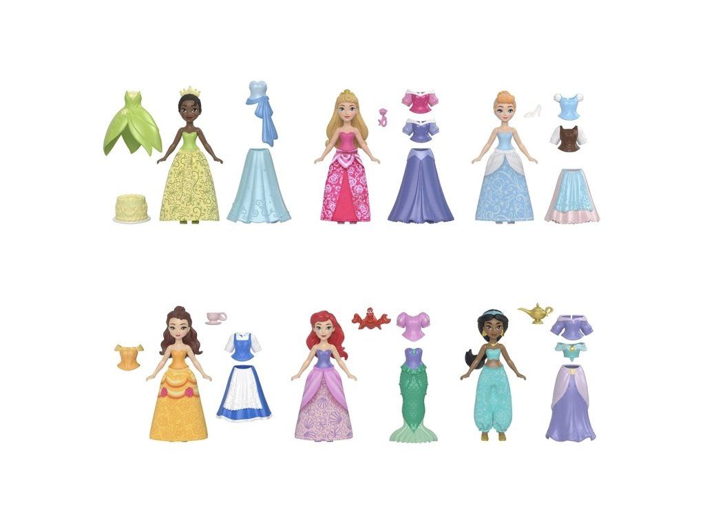 Každá malá panenka Disney obsahuje 2 charakteristické módní doplňky inspirované nezapomenutelnými filmovými momenty, celkem tedy 12 outfitů. Těchto 6 malých panenek princezen, inspirovaných animovanými postavičkami z filmů Disney, je připraveno na každé dobrodružství. Každá panenka Disney princezna je dodávána se 2 odnímatelnými módními doplňky a nezapomenutelným doplňkem z jejího příběhu.