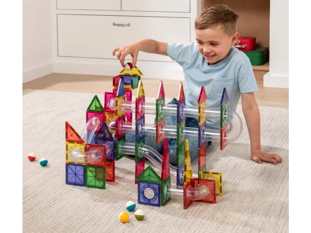 Sada se 125 dílky kombinuje klasické magnetické dlaždice s průhlednými trubicemi a spojkami. Magnetické bloky pevně drží pohromadě a lze je znovu a znovu přeskládat. Cihlu po cihle postavíte rozsáhlou magnetickou kuličkovou dráhu se stoupáními, tunely a změnami směru. Někdy je to rychlé, někdy pomalé, v závislosti na tom, jak je dráha nastavena.