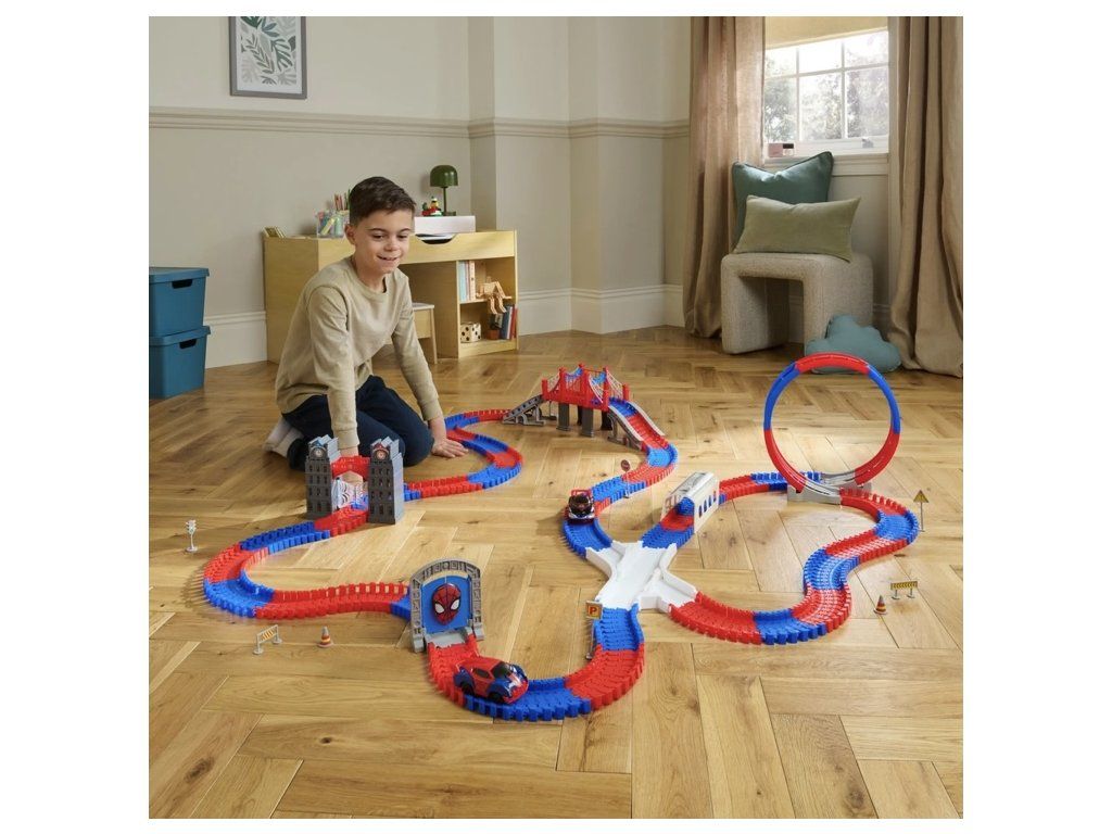 Znovuvytvořte si ikonickou scénu se Spider-Manem s touto sadou závodní dráhy Marvel Spider-Man. Sada trati s 384 dílky měří po sestavení úctyhodných 5,3 metru na délku. Obsahuje dvě ikonická auta Spider-Mana, věže svítící ve tmě, tunel a otevírací bránu. Most s realistickou pavučinou svítí ve tmě.