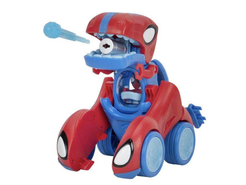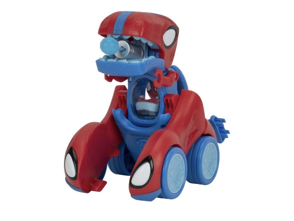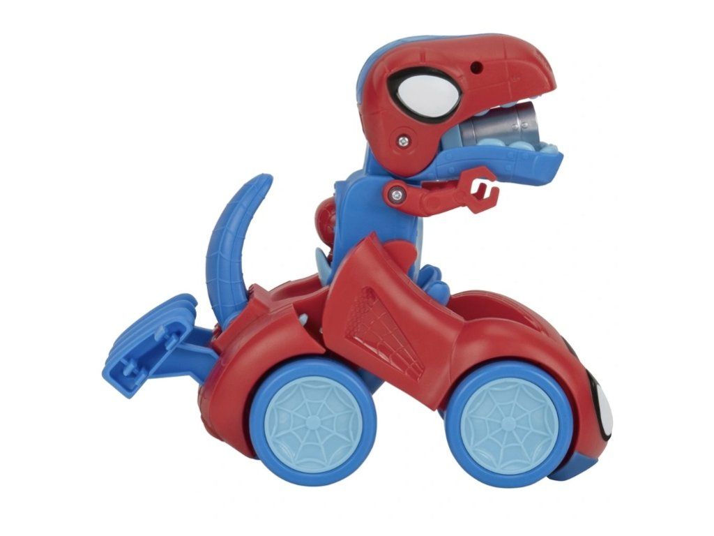 V režimu vozidla stiskněte ikonu pavouka pro aktivaci vzrušujících zvuků. Zatáhněte za střešní páku a sledujte, jak se vaše vozidlo promění v nebojácného Spidey-Rexe. Vložte „pavučinové šipky“ do spoileru a dalším stisknutím ikony pavouka je vystřelte přímo z tlamy Spidey-Rexe. Je nebezpečí pominulo? Pak jednoduše sklopte Spidey-Rexovu hlavu a ta se promění zpět v skvělé vozidlo.