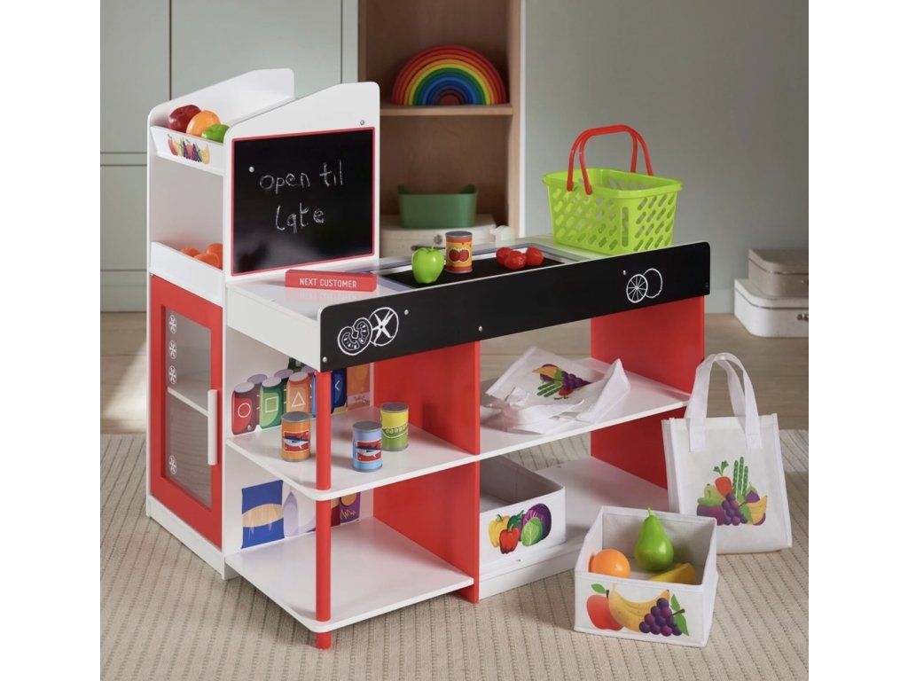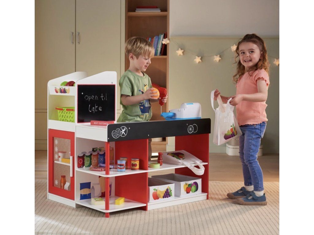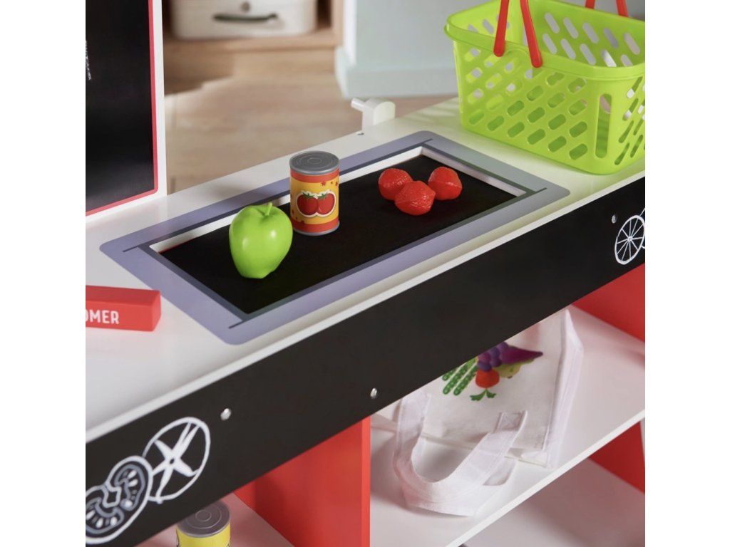 Tato dřevěná hrací sada do obchodu s potravinami obsahuje dopravní pás, který se dá otáčet pákou! Součástí je tabule na psaní zpráv a oznámení a spousta polic na vystavování zboží! Dokonce je zde i skříňka, kterou lze použít jako ledničku.