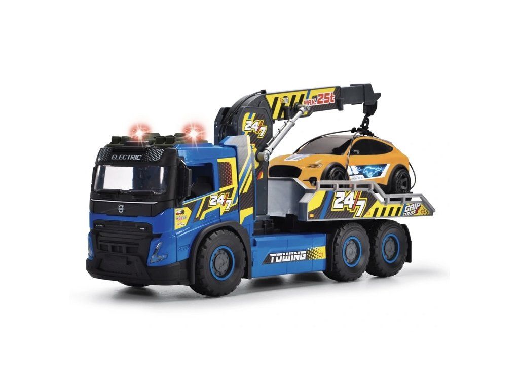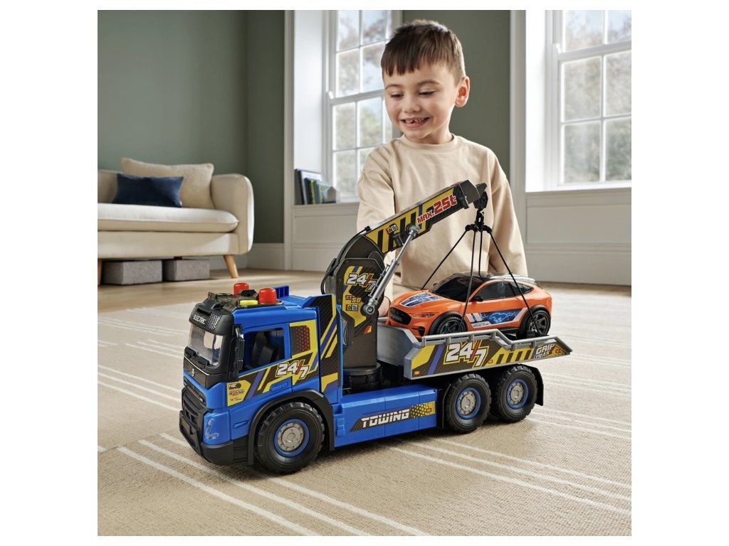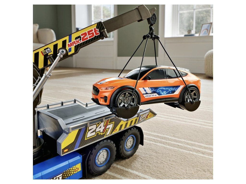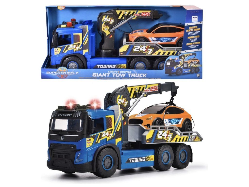 Objevte realistickou zábavu z jízdy s obří sadou odtahovky Super Wheelz! 54 cm dlouhá odtahovka Volvo FMX zaujme detailními světelnými a zvukovými efekty, ručně ovládaným jeřábem a naklápěcí nakládací plošinou pro všestranné použití. Sada obsahuje také SUV Ford Mustang Mach-E v měřítku 1:64 s autentickým designem, ideální pro hraní realistických záchranných scénářů.