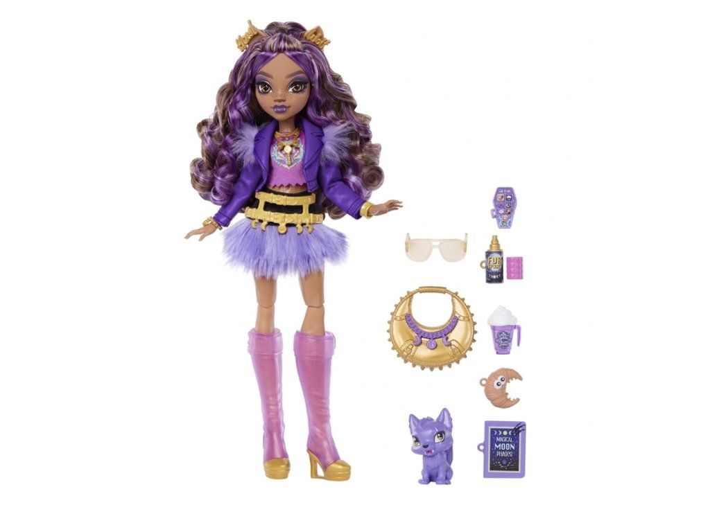 Pozor, husí kůže: Styl této panenky z Monster High je úžasný! Clawdeen Wolf je neodolatelně módní ve svém chlupatém fialovém oblečení se sedmi doplňky. Vlkodlak má na sobě kombinaci měsíčního vytí: motorkářskou bundu, sukni z umělé kožešiny a kozačky po kolena. Zlaté detaily od hlavy až k patě dodávají nádech nebeského kouzla. Součástí oblečení je kabelka s půlměsícem a sluneční brýle. Na školní léta si Clawdeen sbalila sprej na kožešinu, iCoffin, knihu s fázemi měsíce a kosmický croissant.