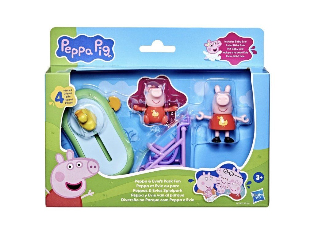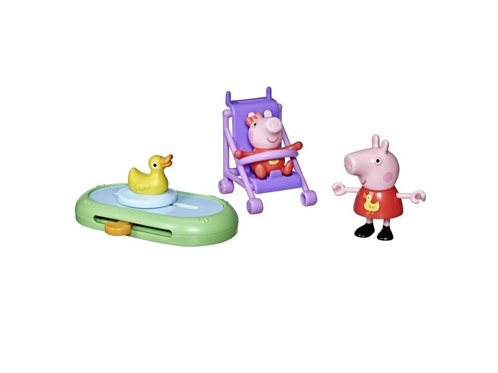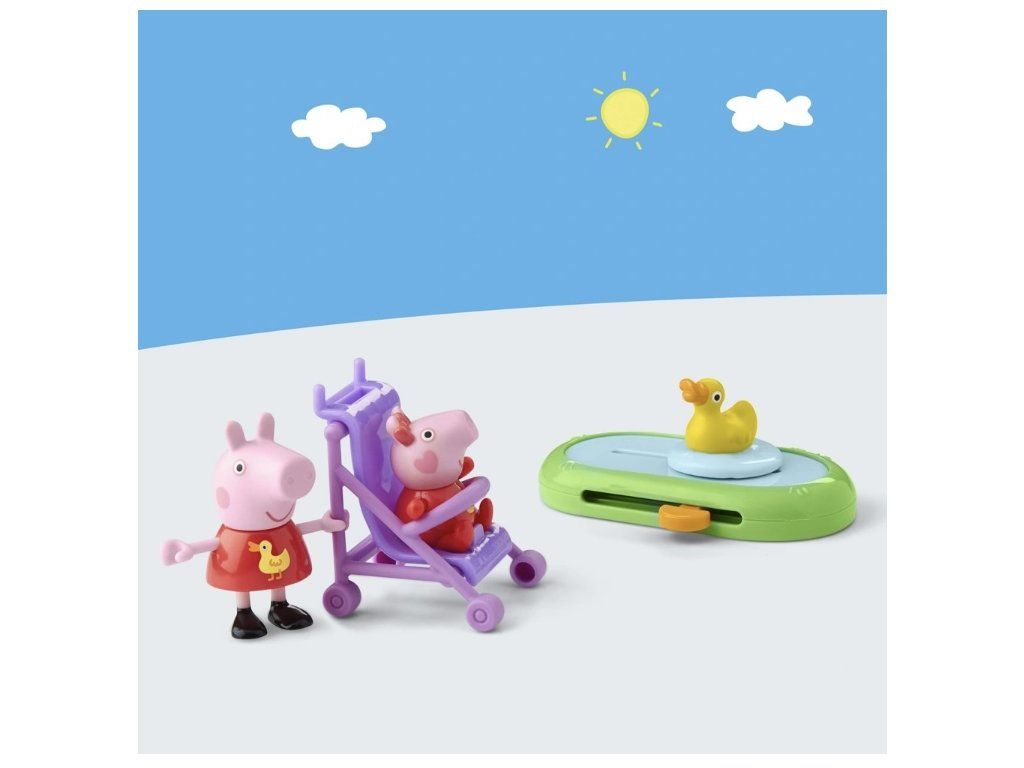 Sada obsahuje dvě oblíbené figurky Prasátka Peppa, Peppu a její malou sestru, v shodných žlutých kachních kostýmech. Malí si dokážou představit Peppu, jak tlačí dítě v kočárku a sleduje kachny, jak plavou v rybníku.