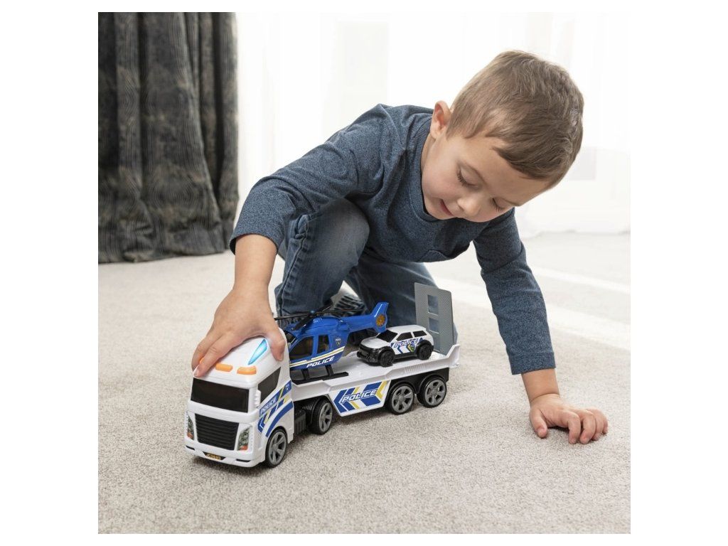 Chraňte své město se sadou policejního transportéru Super Wheelz! Transportér má blikající modrá světla a sirénu. Jeho kola se volně otáčejí, což zajišťuje plynulý transport policejního vrtulníku a policejního auta v zadní části. Policejní vrtulník má volně pohyblivé listy rotoru a policejní auto lze tlačit z nákladové plošiny a po zemi po vlastních volně se otáčejících kolech. Znovu si vytvořte vzrušující dobrodružství s touto sadou Super Wheelz.