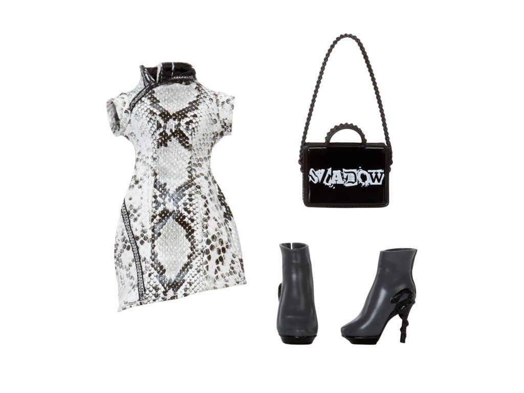 Heather Grayson předvádí, jak lze kontrast černé a bílé stylizovat elegantně i odvážně. Jedna strana jejích dlouhých hedvábných vlasů je bílá, druhá černá. Její šedé šaty s hadím vzorem spojují obě strany a zdůrazňují její světle modré oči s dlouhými řasami. Vzhled doplňuje černá kabelka s bílým logem Shadow High.