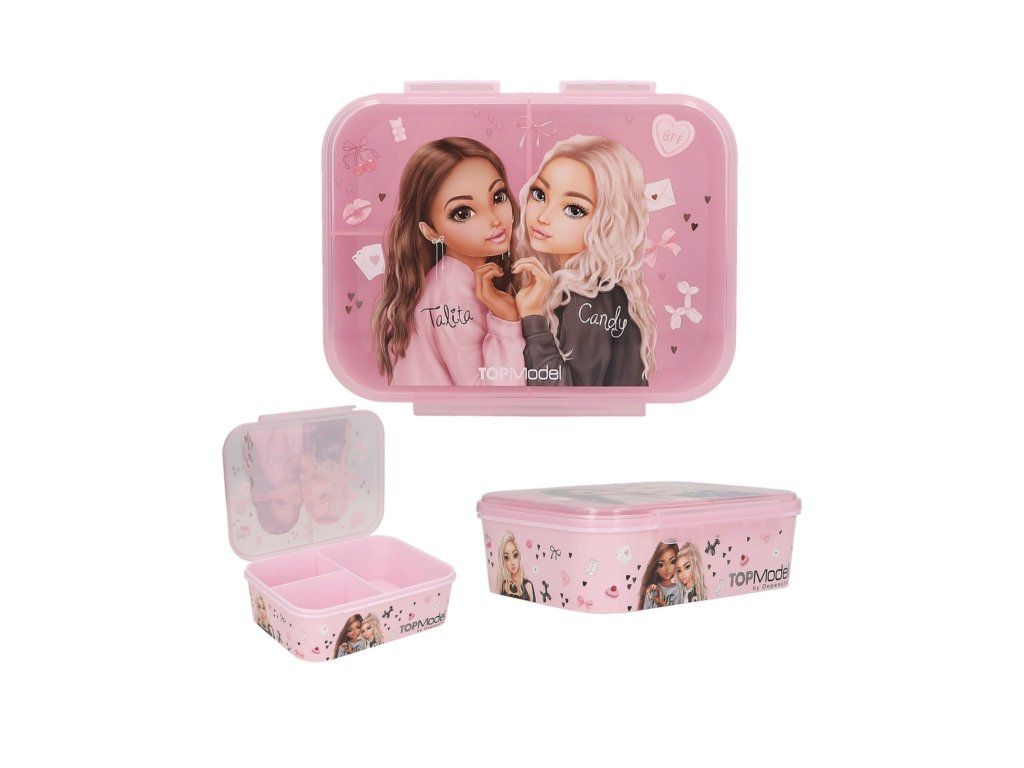 Svačinový box Top Model MY BFF – styl a praktičnost v jednom. Tento růžový svačinový box zdobí nádherný motiv kamarádek doplněný o roztomilé ikony mašliček, srdíček a dalších detailů. Potisk je umístěn na jednodílném průhledném víku i po stranách boxu, což mu dodává originální vzhled.